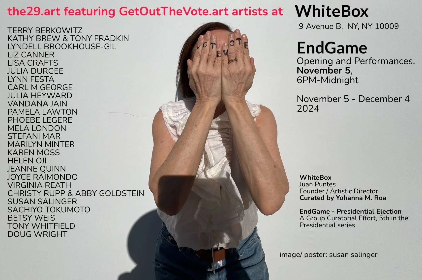I co-created GetOutTheVote.art with the29.art artists Kathy Brew, Stefani Mar, and Liz Canner, to be used for artists to engage in the political discourse of the 2024 presidential election. The website served as a way to post and share artists’ work that addressed climate change, bodily autonomy, democracy, and anything else that could inspire people to vote in November. People can still download the work for free and use it on social media, flyers, postcards. Liz Canner put her image on an enormous banner, hired a small plane, and flew it over a packed football stadium, while friends handed out over 700 postcards that day.